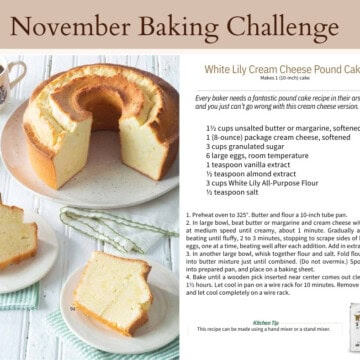 I'm excited to announce that we have teamed up with White Lily Baking Company for our November Baking Challenge! For this challenge, we are baking their Cream Cheese Pound Cake recipe. I can't wait to see your version of this cake!